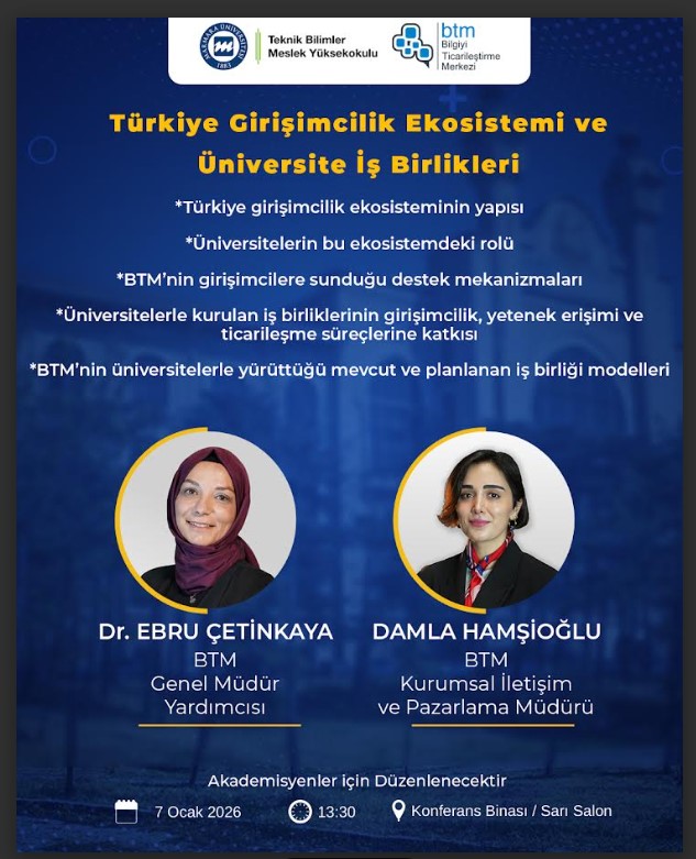 Teknik Bilimler Meslek Yüksekokulu koordinasyonunda, BTM (Bilgiyi Ticarileştirme Merkezi) yöneticilerinin katılımıyla üniversitemiz akademisyenlerine yönelik bir etkinlik düzenlenecektir.